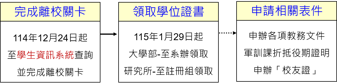 民國114年12月24日(星期三)起至【學生資訊系統】\【新生及畢業生專區】\【離校手續管制關卡】查詢及完成各項管制關卡。